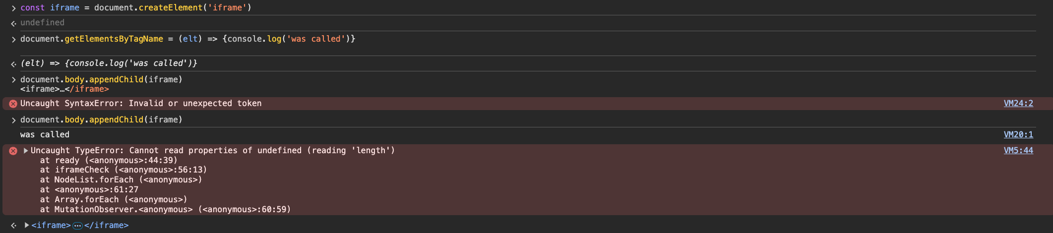 document.body.appendChild(iframe)When we run the previous code with an undetectable browser instance our getElementsByTagName function is called. We see the was called string in the browser console, and it also triggers an error because we don’t override our function properly (on purpose) to easily catch the caller of getElementsByTagName.