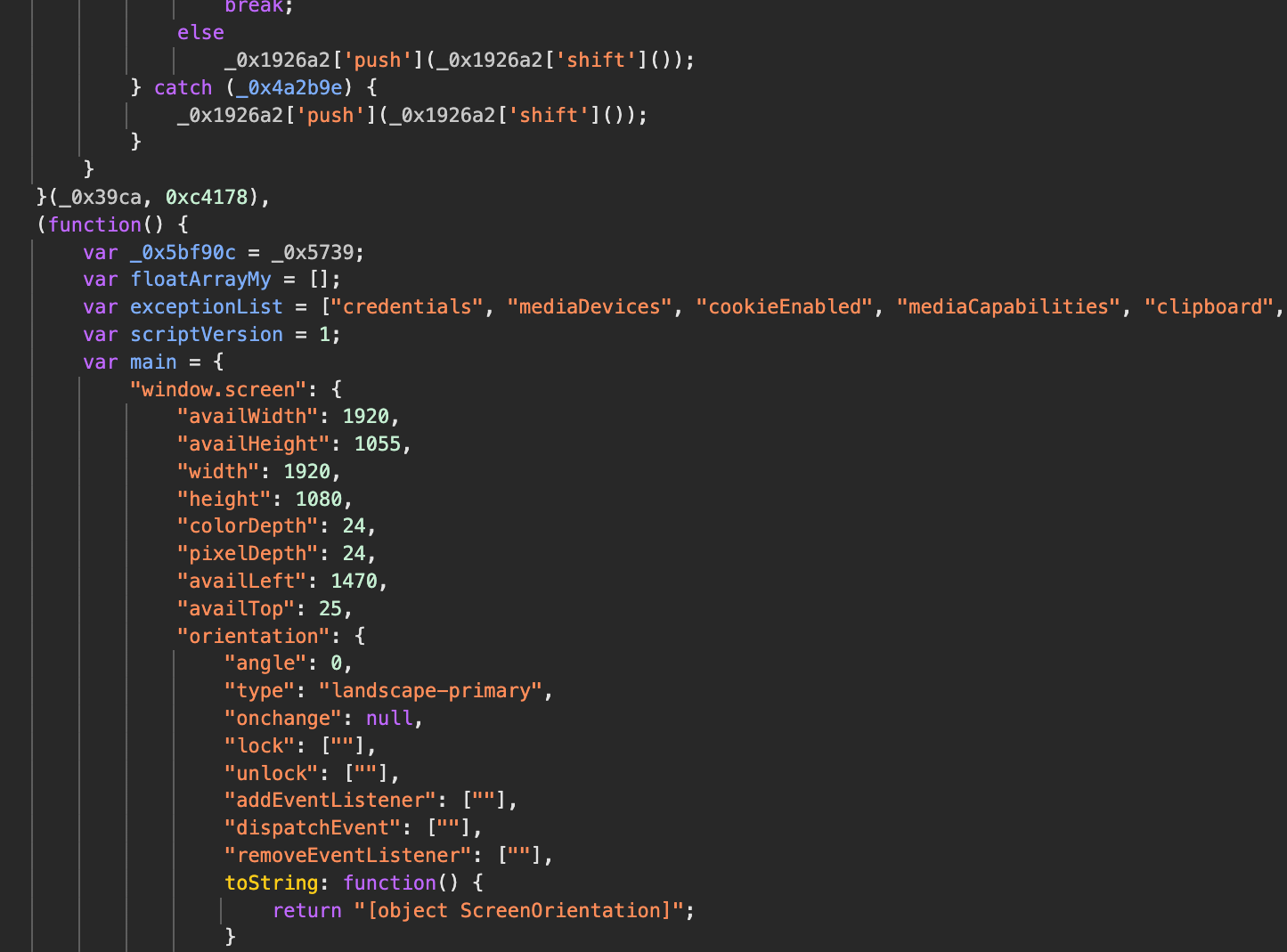 Then, there are ~800 lines that define the main object. It contains all the data needed to lie about the user's device fingerprint.
