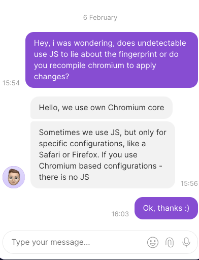 }To summarize, the script injected by Undetectable only apply lies for non-Chromium based browsers. This was confirmed by Undetectable support.