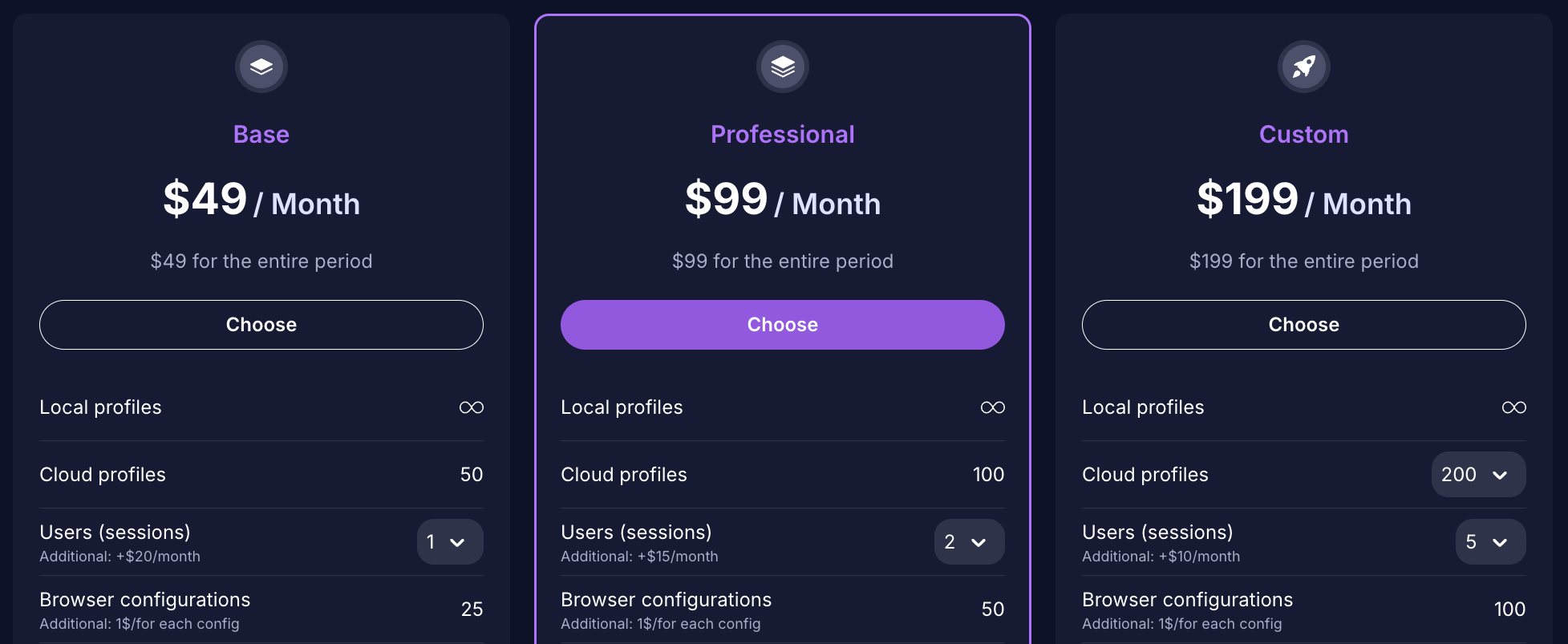 Even though it can be used for free, they have different pricing plans that offer more or less features, including the possibility to use diverse browser fingerprints (aka browser configurations on their site).
