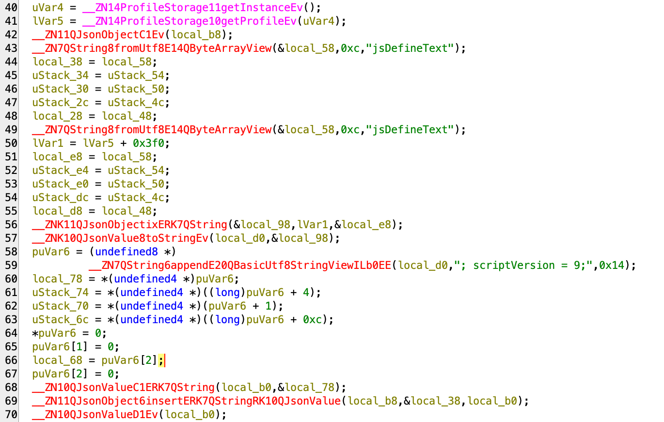 We start with the chrome_helper binary. If we look at the strings extracted by Ghidra, we notice the scriptVersion strings that we found in the JS script we analyzed in the previous section.