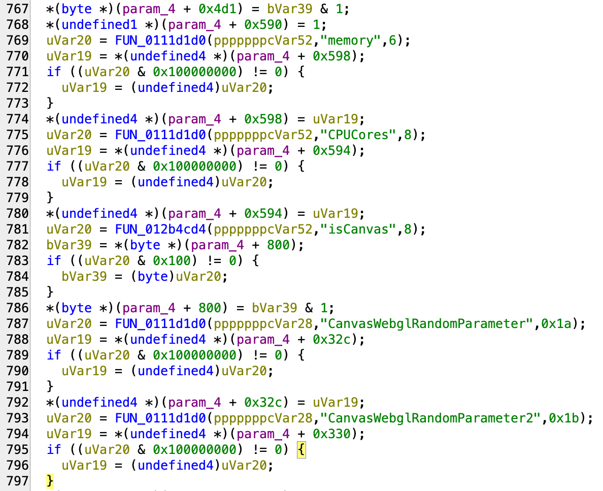 For Chromium-based browsers, the lies are directly applied within Chromium. To learn more, we use Ghidra to reverse engineer the key binaries used by Undetectable.