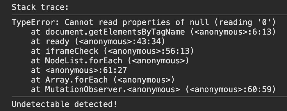 document.body.appendChild(iframe) When we execute the code in Undetectable, we see the following stack trace. It contains traces of functions defined by Undetectable such as ready and iframeCheck. Thus, we can detect the presence of the anti-detect Undetectable browser with high accuracy.