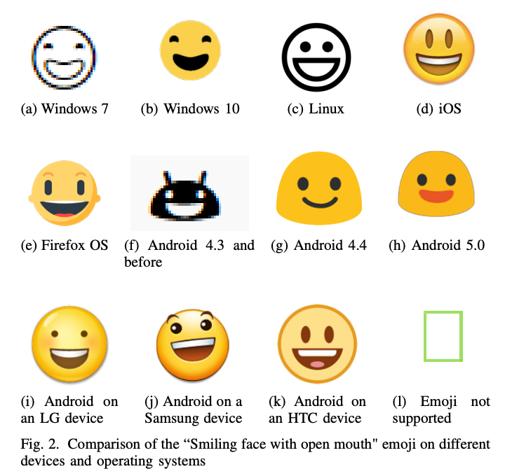 You may be wondering why so many canvas fingerprinting challenges use emojis. As shown by Laperdrix et al. in their "Beauty and the Beast: Diverting modern web browsers to build unique browser fingerprints” paper, canvas fingerprints leverage emojis since their rendering depends on the OS or even the type of phone, cf image below.