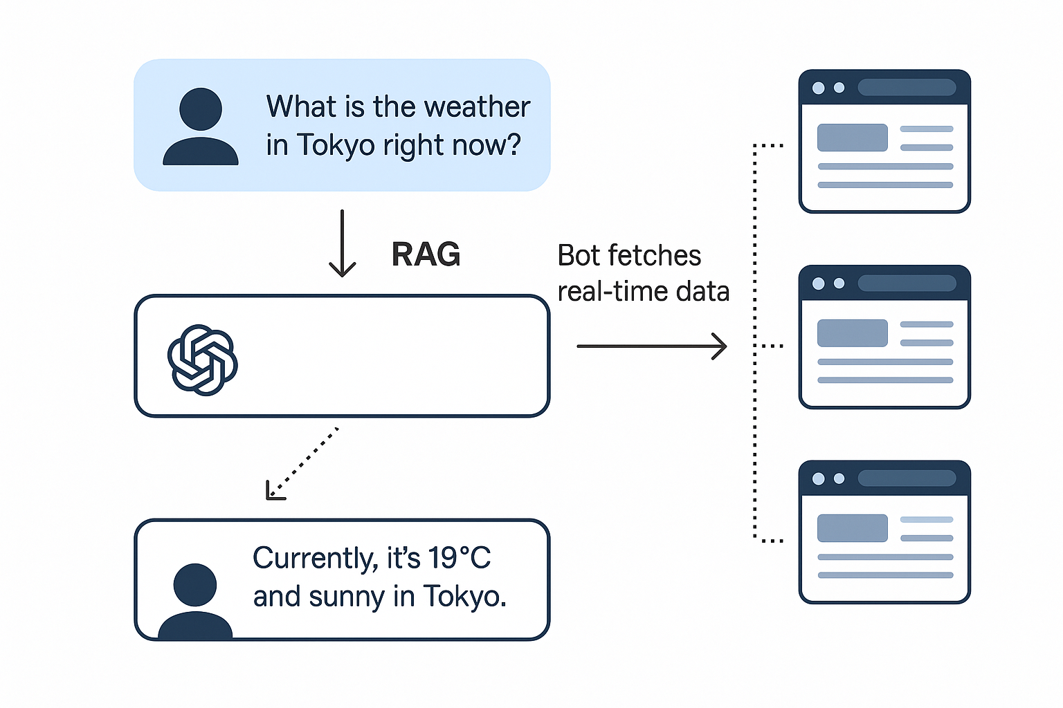 In a typical RAG flow, the system identifies gaps in the model’s knowledge during a user interaction. If the user asks, “What’s the weather in Tokyo right now?” the model itself can’t answer reliably from static training data. Instead, it delegates the task to a retrieval component, a bot that performs a live web request to fetch up-to-date information. The result is then passed back to the model, which incorporates it into a final, user-facing response.