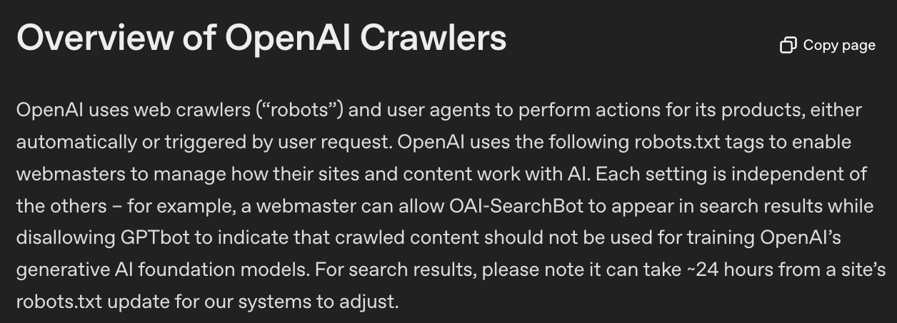 Several major AI companies operate dedicated crawlers and provide documentation about their use. OpenAI, for instance, runs GPTBot, which is explicitly designed to retrieve public content that may be used in model training. Its user agent is: