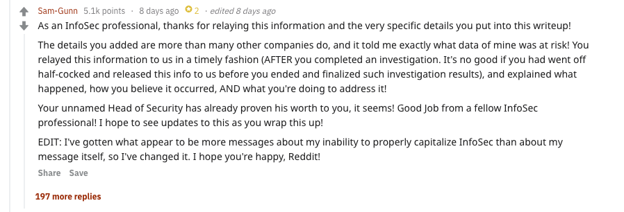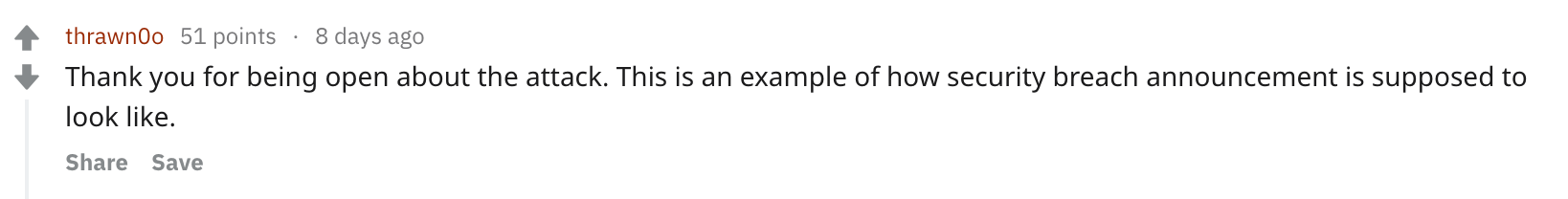 Hats off to the Reddit team for the way this incident was handled as incidents are nightmares to deal with, both for users and organizations. We’ve seen other companies suffer larger scale breaches and sweep them under the rug without an explanation of the impact to users.