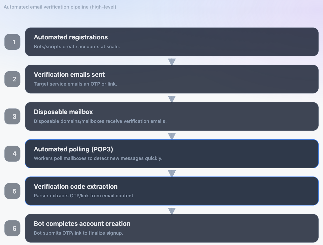 Unlike public disposable email providers, these domains appear to be part of a custom email infrastructure operated by the attackers specifically to handle verification emails generated during automated account creation.