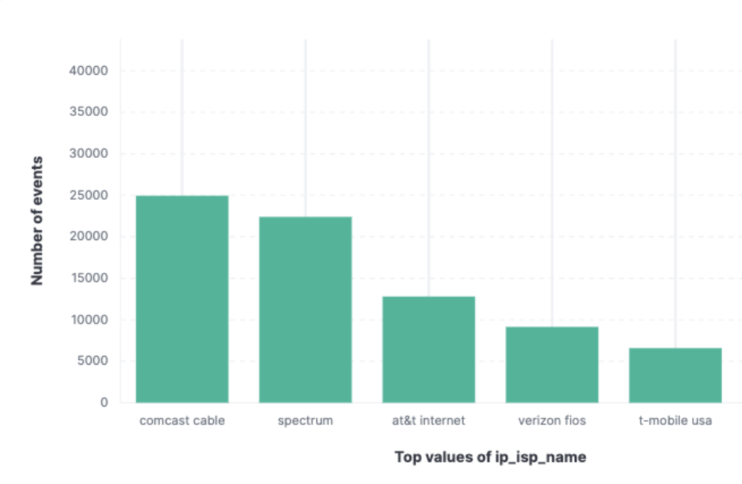 The attack traffic is distributed across a large residential proxy network. Requests originate from thousands of IP addresses belonging to major US internet providers.